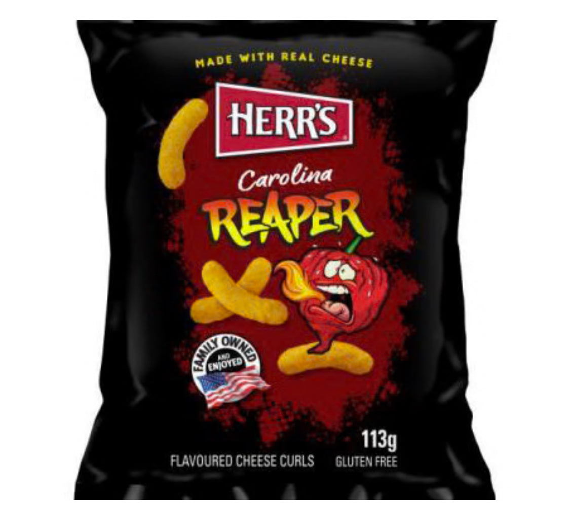 Nichts für schwache Nerven! Herr's Crunchy Cheese Curls Carolina Reaper sind ein feuriger Genuss aus den USA für alle, die eine ordentliche Portion Schärfe vertragen können. Die krossen Mais-Sticks wurden mit einer Gewürzmischung aus extrrem scharfen Carolina Reaper Chili und einer Portion Käse verfeinert. Daraus ergibt sich eine herzhafte Geschmacksexplosion, die pikant und lecker ist.